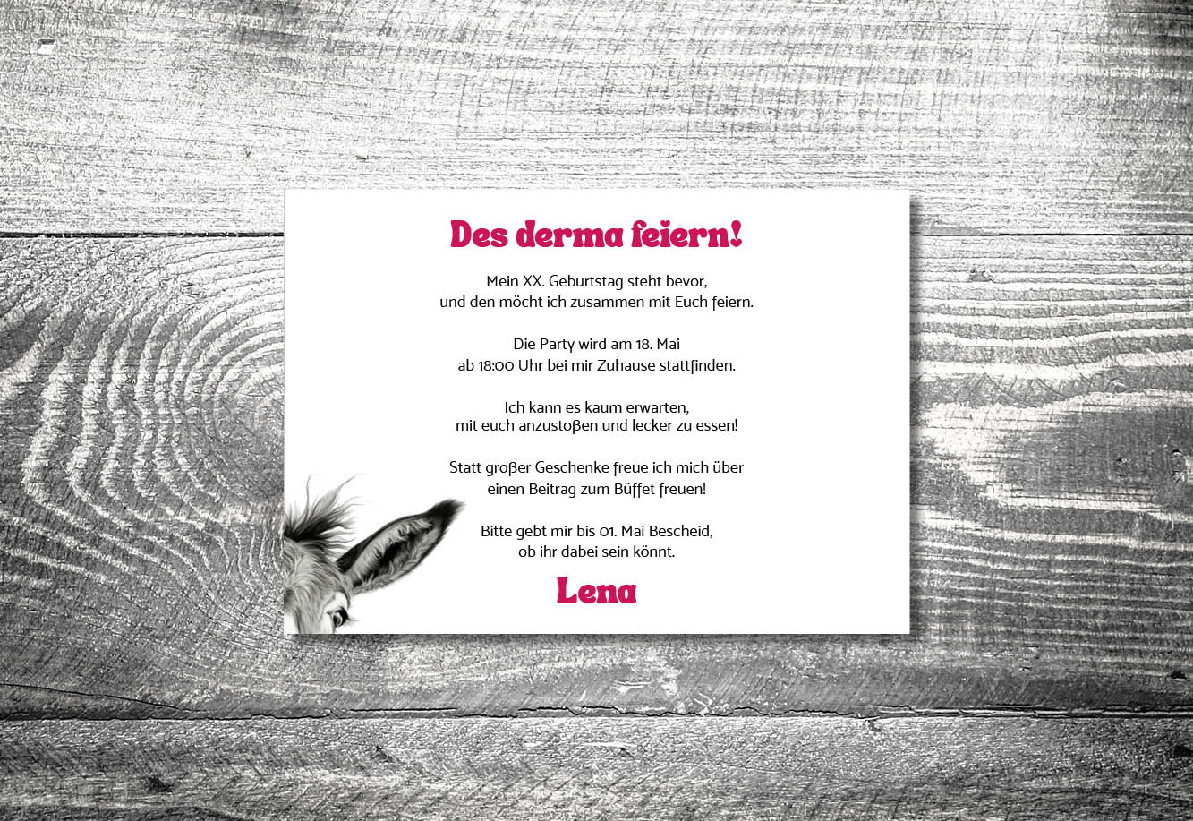 Hast Du besondere Wünsche bezüglich des Designs? Möchtest Du eine andere Farbe (Farbauswahl) oder Schrift (Schriftenauswahl)? Wir helfen Dir Dein individuelles Design zu erstellen.