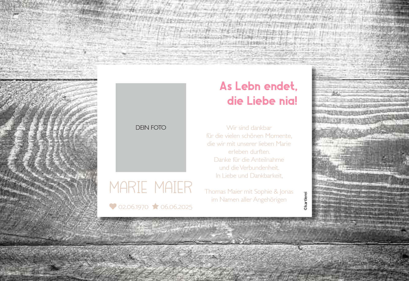 Hast Du besondere Wünsche bezüglich des Designs? Möchtest Du eine andere Farbe (Farbauswahl) oder Schrift (Schriftenauswahl)? Wir helfen Dir Dein individuelles Design zu erstellen.